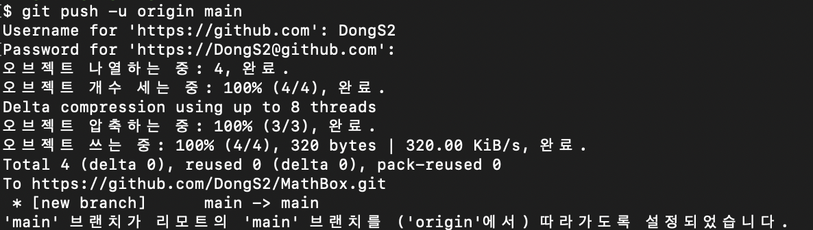 git push -u origin master : 로컬 레포지토리에 있는 master 브랜치의 내용을 orgin이라는 리모트 레포지토리로 보낸다.