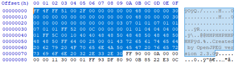 SOC는 code stream의 시작으로 0xFF4F다. sample file을 열어본 결과 시작 부분이 0xFF4F 임을 확인할 수 있다.