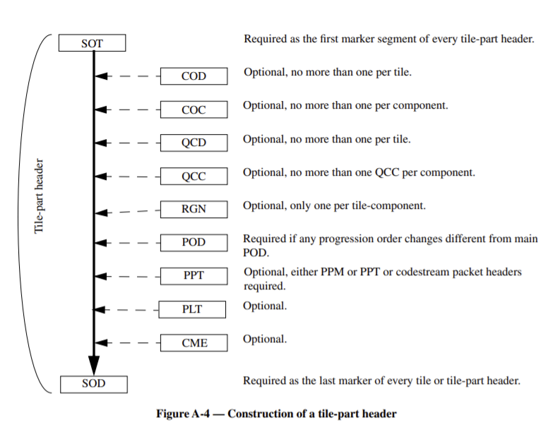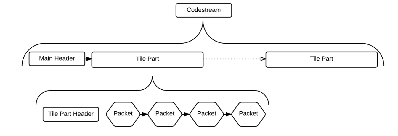 코드 스트림의 구조는 다음과 같이 main header와 tile-part header들로 구성된다.