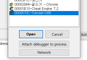 먼저, Open process를 통해서 튜토리얼 프로세스를 치트 엔진에 붙혀야한다.