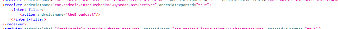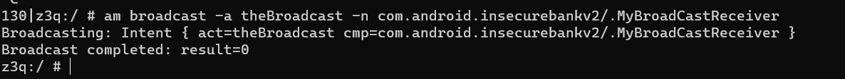-> 아까 Mainfest에서 봤듯이 브로드캐스트명 = theBroadcast, 패키지명=com.android.insecurebankv2, 서비스 경로명=.MyBroadCastReceiver