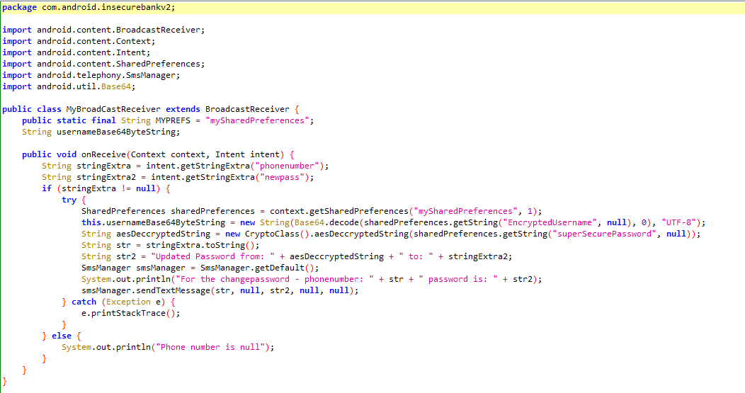 BroadcastReceiver 객체는 onReceive()를 통해 발생된 브로드캐스트를 처리한다. 이 때 intent로 들어온 정보 중 phonenumber와 newpass에 해당하는 스트링을 해당 클래스에 저장한다.