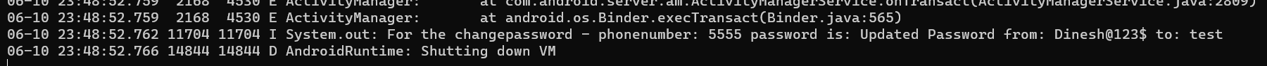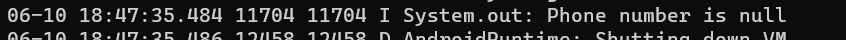 로그캣으로 확인하면 다음과 같이 phone humber is null이 프린트 된걸 확인할 수 있다.