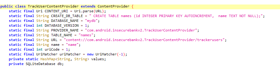 콘텐트 프로바이더의 주소는 content://com.android.insecurebankv2.TrackUserContnetProvier/trackusers다.