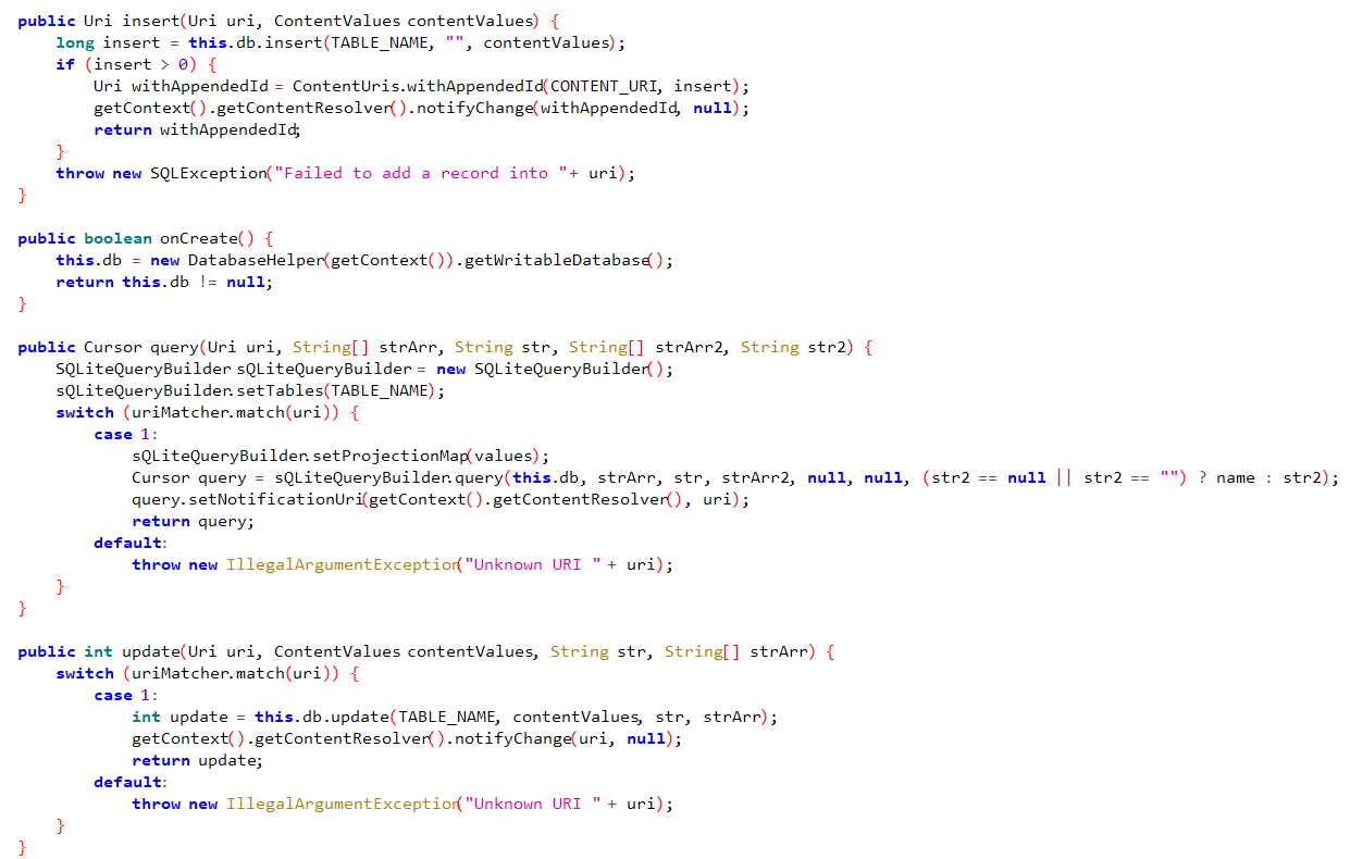 그리고 등록한 uri랑 매치될 경우 delte함수에서는 db.delete(테이블, where 절, where 인자)를 통해 정해진 조건에 해당하는 delte 쿼리를 실행한다. 그리고 content resolver들에게 DB의 내용이 변경됐다는 사실을 알린다.