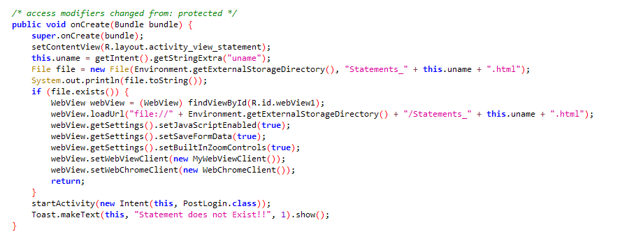 만약에 해당 파일이 존재한다면, webView1 이라는 id를 가진 웹 뷰를 가져오고 file:// 을 이용해 아까 본 파일을 로드시킨다!