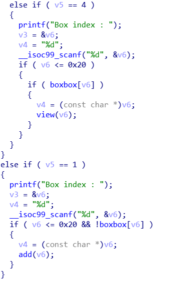 v5가 4일 경우에는 Box의 index를 v6에 입력받고 만약 v6가 0x20 이하이고 boxbox[v6]가 참이라면 v4는 *v6가 되고 view(v6)로 넘어간다.