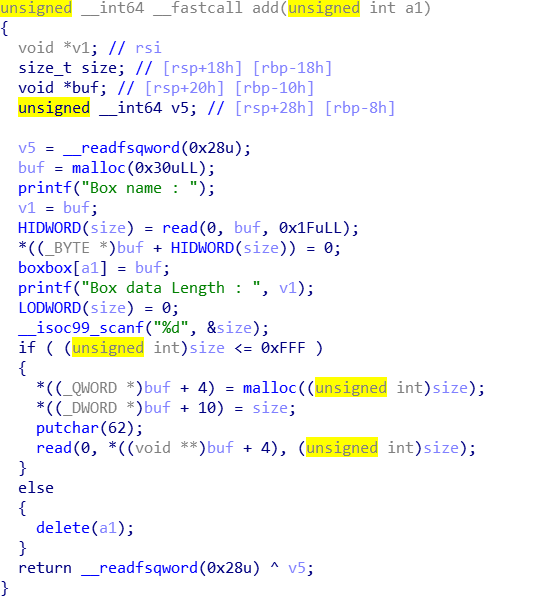 그 다음을 보면 boxbox[a1]에 buf 값을 넣는다. (이 때 a1은 index이다. == v6)