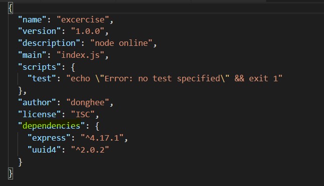 package.json의 scripts 부분도 직접 수정할 수 있는데 예를 들어 "start" : "node index.js" 라고 수정할 경우, cmd 창에서 npm start를 하면 node index.js와 동일하게 index.js가 실행된다. 이 때 start는 예약어기 때문에 다른 추가적인 내용 없이 그냥 npm start만 쓰면 되는데 만약 임의로 "dev" : "node index.js" 라고 한다면 cmd창에서 npm run dev라고 해야한다.