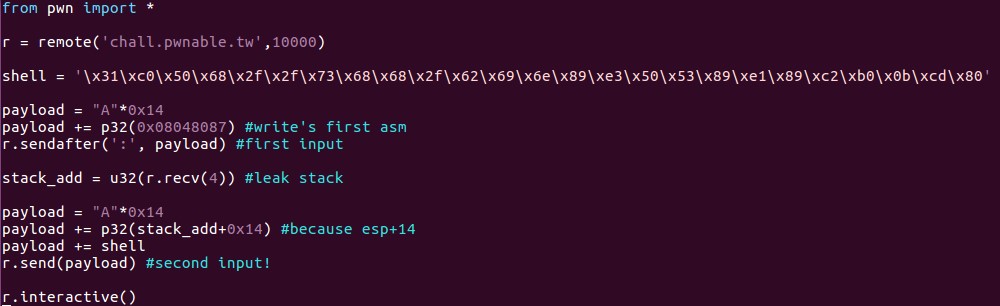 (우리가 leak한 스택 주소에서 +0x14만큼하고 그 위치에 쉘코드를 넣으면 된다.)