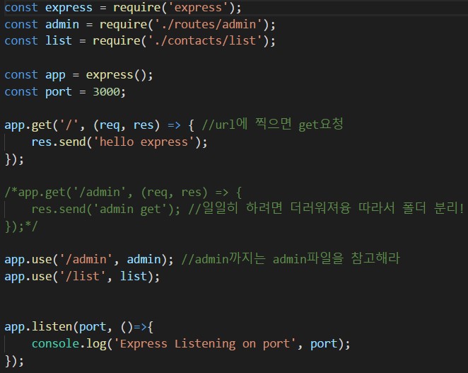 여기서는 admin/이후의 get요청을 정의한다음 export해서 총 관리를 담당하는 app.js에서 해당 라우터 모듈을 마운트해서 use를 통해 간편하게 정리된 모습으로 사용할 수 있다.