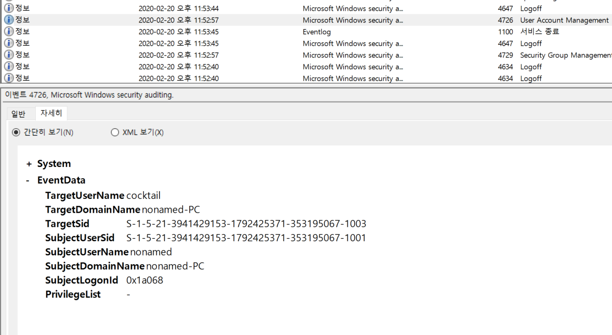 4720 - 계정 생성, 4726 - 계정 삭제