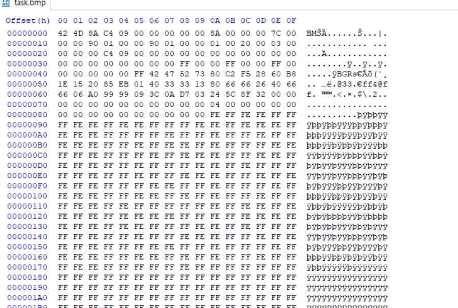 저 부분은 비트맵 데이터(색상값)인데 이 값은 FF 아니면 00 으로 구성된다.