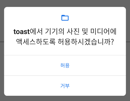 android 6.0부터는 보안 모델이 강화되어 ActivityCompat.requctPermission()를 이용해 각 앱마다 파일 등에 엑세스 할 수 있도록 코딩해야한다. 이 메소드를 사용하면 아래의 사진처럼 사용자가 거부/허용 할 수 있는 대화상자가 나오고 허용을 클랙해야만 파일 등에 접근이 가능하다.
